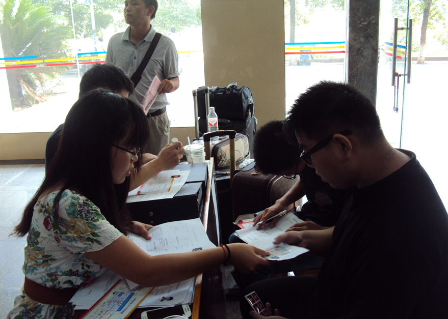 31日早上7:45,值班同学替换走了在迎新岗位上已经坚守了一晚的优秀党员,新的一天的迎新工作又正式开始。随着太阳的升高,南华广场上陆续热闹起来,各迎新点也逐渐忙碌起来。广场上迎新点的同学们面带微笑,为学弟学妹们做引导,带领他们前往九教大厅报到。大厅里亦是一片热情,信息搜集组和材料整理组的同学认真而有序的为新生服务,还有专门负责为学弟学妹搬行囊的同学,他们给家长送座,倒水,忙的不亦乐乎,然而整个过程却井然有序,忙而不乱。公司的彭建南书记还拿出了他的相机,为新生和其父母合影留念,对他们的到来表示热烈的欢迎。