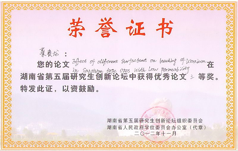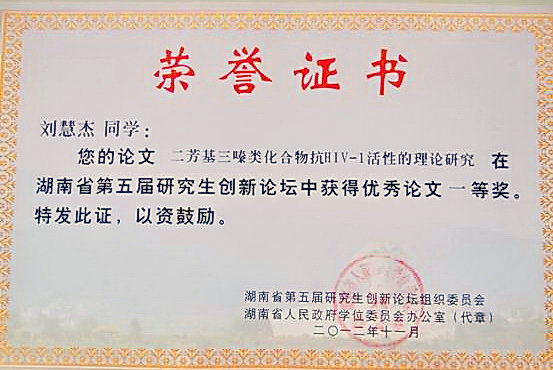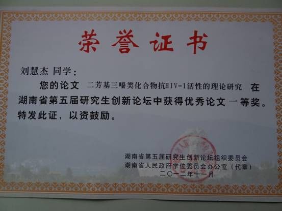 在湖南省第五届研究生创新论坛中,公司10级研究生刘慧杰同学的论文《二芳基三嗪类化合物抗HIV-1活性的理论研究》在研究生创新论坛中荣获一等奖;蔡贵龙同学的论文《Effect of different Surfactant on Leaching of Uranium in Sandstone type Ores with Low Permeability》荣获三等奖。他们的论文分别由公司的聂长明老师和谭凯旋老师指导。在公司“第六届研究生楚岳节研究生学术报告竞赛”中,刘慧杰同学获得二等奖。研究生创新论坛两个奖项的获得,是公司研究生继2008年陈炫同学获一等奖后在学术研究上的又一次突破,体现了化工公司学子在化学科学研究方面取得的重大进步和公司老师的辛勤指导。