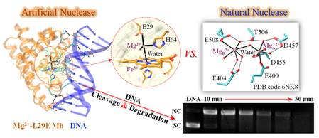 人工核酸酶分子在生物技术和生物医药领域,特别是在基因工程和新型抗菌抗病毒等试剂的发现中具有重要的应用。然而,很少有人工核酸酶分子既能切割又能降解核酸DNA分子。近日,永利集团3044林英武教授课题组在国际催化领域权威杂志《ACS Catalysis》(中科院一区; IF=12.35)发表研究成果——《Rational Design of an Artificial Nuclease by Engineering a Hetero-Dinuclear Center of Mg-Heme in Myoglobin》,同时申请了国家发明专利。