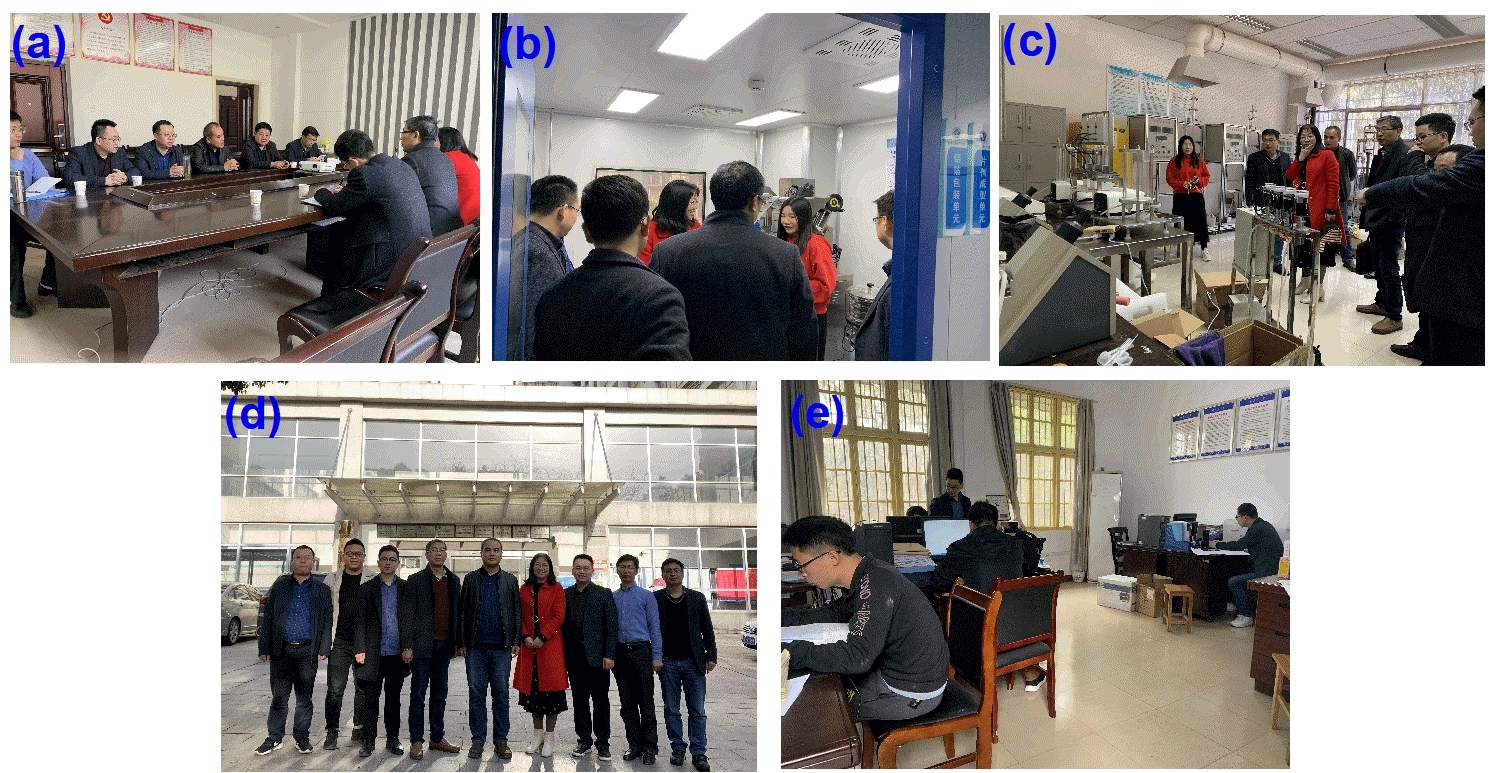 (a) 经验交流会上双方深入讨论;(b) 参观GMP片剂成型车间;(c) 参观分离工程实验室;(d) 离校前合影留念;(e) 翌日全体制药系老师落实交流精神;