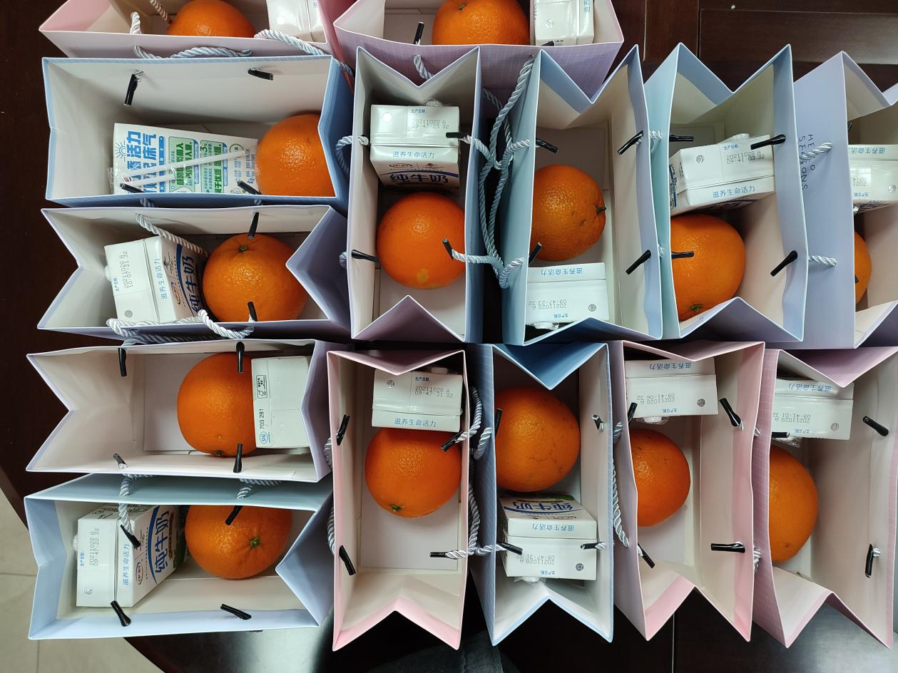 最后,公司为所有考研的同学献上最真诚的祝福,为每一位考研学子都准备了写满祝福语的贺卡和美好寓意的礼品。卡片上,既有老师们祝福的话语,也有来自学弟学妹们的鼓励与支持。礼品袋中有一个橙子和一瓶牛奶,寓意心想事“橙”,牛气冲天,祝愿大家聚力青春,“橙”功上岸。