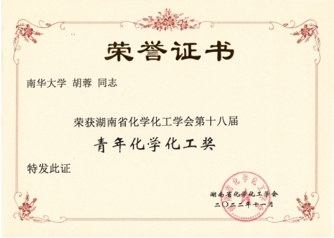 2022年10月26日,湖南省化学化工学会公布8位“湖南省第十八届青年化学化工奖”得主,公司青年高层次人才胡蓉博士获此殊荣。