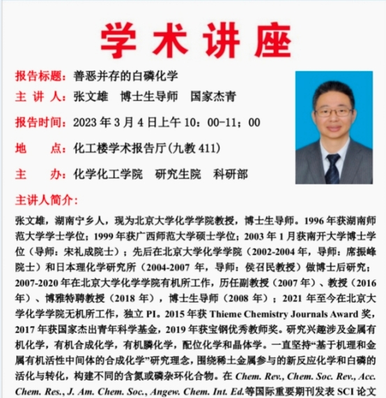 2023年3月4日上午10点,应永利集团3044邀请,北京大学张文雄教授以《善恶并存的白磷化学》为题为公司师生进行了精彩的学术报告。公司经理林英武教授担任主持,公司相关领域的老师和员工参加了此次报告。
