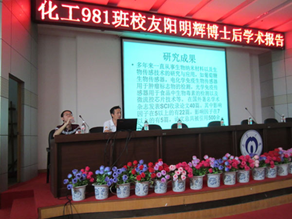 报告开始时,化学化工公司党委副书记彭建南老师对阳明辉博士后进行了介绍。阳明辉,中国共产党党员,1998年在化工公司就读化学工程与工艺专业;2001年考取湖南大学化工公司研究生;2007年6月——2009年3月在美国食品与药品生物分部、马里兰大学巴尔的摩分校做博士后研究;2009年——2010年在威斯康星大学密尔沃基分校做博士后研究;2011年就任中南大学副教授。阳教授多年来一直从事生物纳米材料在生物传感器中的研究及运用,在科研领域取得了巨大的成就,至今已在国外著名学术杂志发表SCI收录论文40篇,论文共被引用500余次。