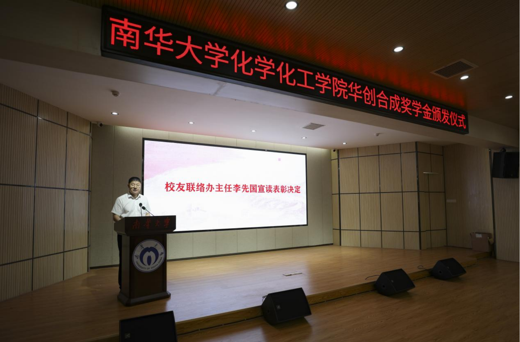 李先国宣读了获奖同学名单,到场嘉宾为八位获奖同学颁发永利集团3044华创合成奖学金证书并合影留念。