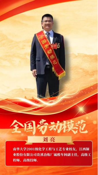 刘亮,公司2001级化学工程与工艺专业员工,江西铜业股份有限公司贵溪冶炼厂硫酸车间副主任,高级工程师、高级技师,荣获“全国劳动模范”、“全国五一劳动奖章”、“全国技术能手”、“江西省劳动模范”、享受国务院政府特殊津贴。