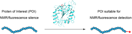 对蛋白质进行位点特异性的化学修饰是一种进行蛋白质工程改造的有效方法。本方向侧重于使用蛋白酶在生物大分子的特定位点引入可以用于核磁共振检测或荧光检测的小分子基团,助力于研究溶液态蛋白质的动力学性质。