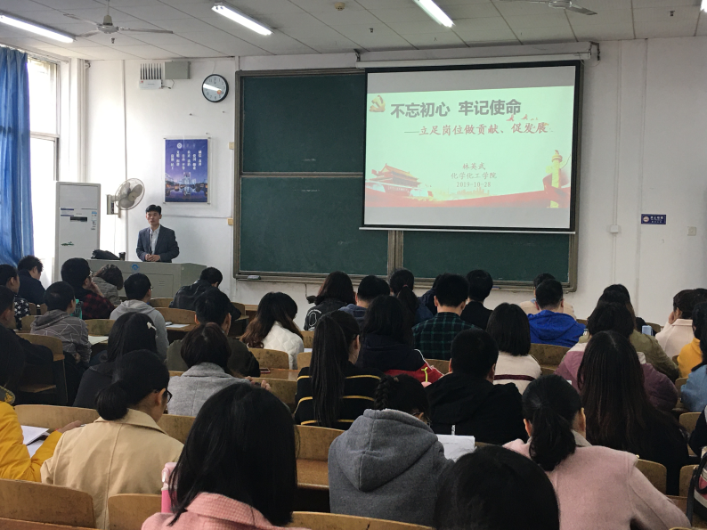 林英武书记通过引用汉语词典中“初心”和“使命”在定义,指出中国共产党人的初心和使命就是为中国人民谋幸福,为中华民族谋复兴。分别从牢记历史、坚守政治灵魂、敢于责任担当、不忘人民群众以及发扬民族精神五个方面进行了讲解;接着针对“为什么”和“怎样才能”不忘初心、牢记使命进行了深入浅出的举例讲述,强调只有做到不忘初心、牢记使命,才能安身立命,指出党员同志在工作、学习和生活中要时刻牢记共产党员的身份,要敢于亮出共产党员的身份;最后,林英武书记将“不忘初心、牢记使命”与立足岗位作贡献相结合进行了讲解,提倡全体党员做“信念坚定、服务群众、遵纪守法和敢于创新”的模范。
